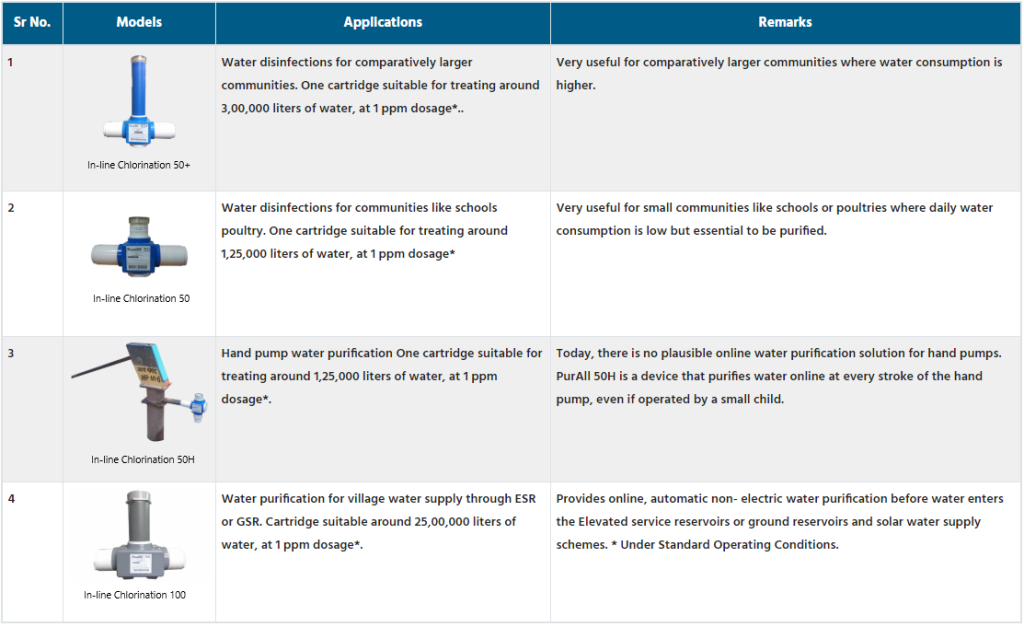 It is advised that these devices be connected to the main raw water supply line as per Fig 1 above. Only in rare cases, if installation as per Fig 1 above is not possible, then it can be installed as per Fig 2 above. The valves used should be of the type that will not restrict the flow very much, such as ball valves or gate valves. During operation it will be necessary to take samples downstream of the unit to check the chlorine residual. The sample must be drawn after the chlorinated flow has merged with the bypassed flow. A sample tap might be installed for this purpose. In operation, the water flows by gravity through the bypass line (Fig 1) or in a pressurized bypass line (Fig2) through our units. In this arrangement adequately chlorinated water is mixed in raw water to have desired free chlorine. The dose should remain relatively constant regardless of the rate of flow. The chlorine dose so adjusted should be sufficient to satisfy the chlorine demand and provide a residual level in the distribution system. If it adds more chlorine to the water than is needed for these purposes, the chlorine dose can be controlled by the amount of water bypassing our unit. To increase or decrease the dose the bypass valve may be adjusted to divert more or less water through the unit. During operation the bypass valve will normally be partially or completely closed for flow control and the isolation valve will be partially or wide open. The valves once adjusted are seldom required to be changed for a site, unless there is a marked change in raw water parameters- viz flow rate. The technology has been supplied in more than 9000 units of different models in different States in India and abroad. The Technology has already Won many awards on National and International Front on its Innovative concept like ” the Most Innovative New Technology of the Year 2016″  at the World CSR Congress & Awards and the Golden Peacock Awards 2019 at Dubai, for Best New Technology in Water Disinfection.